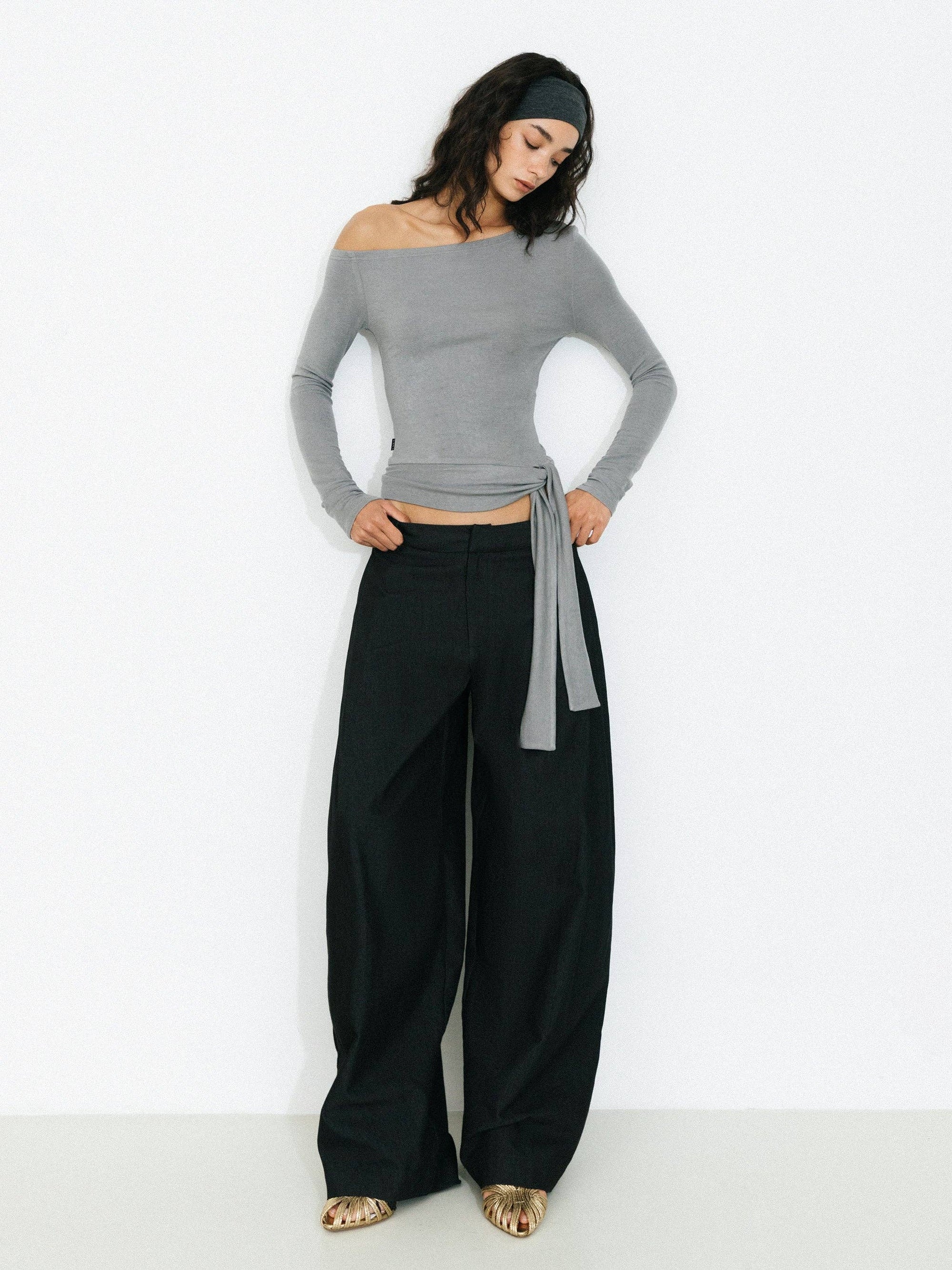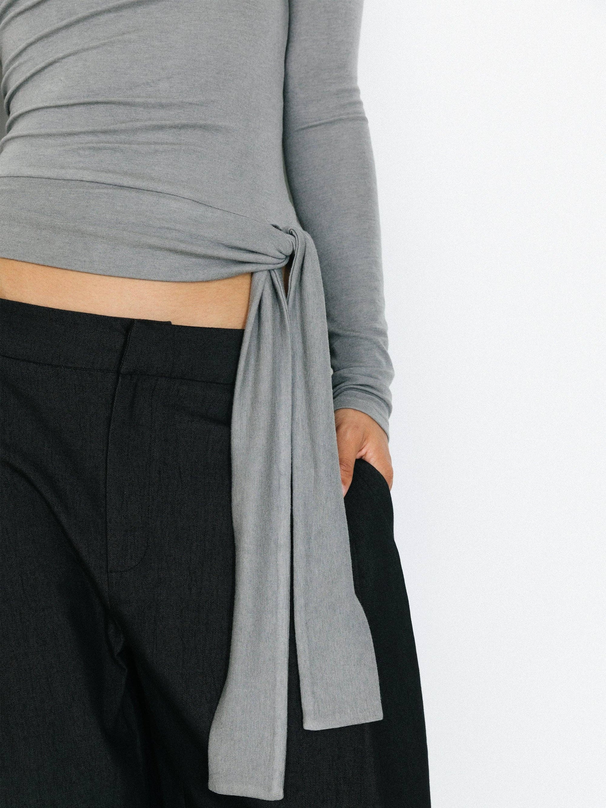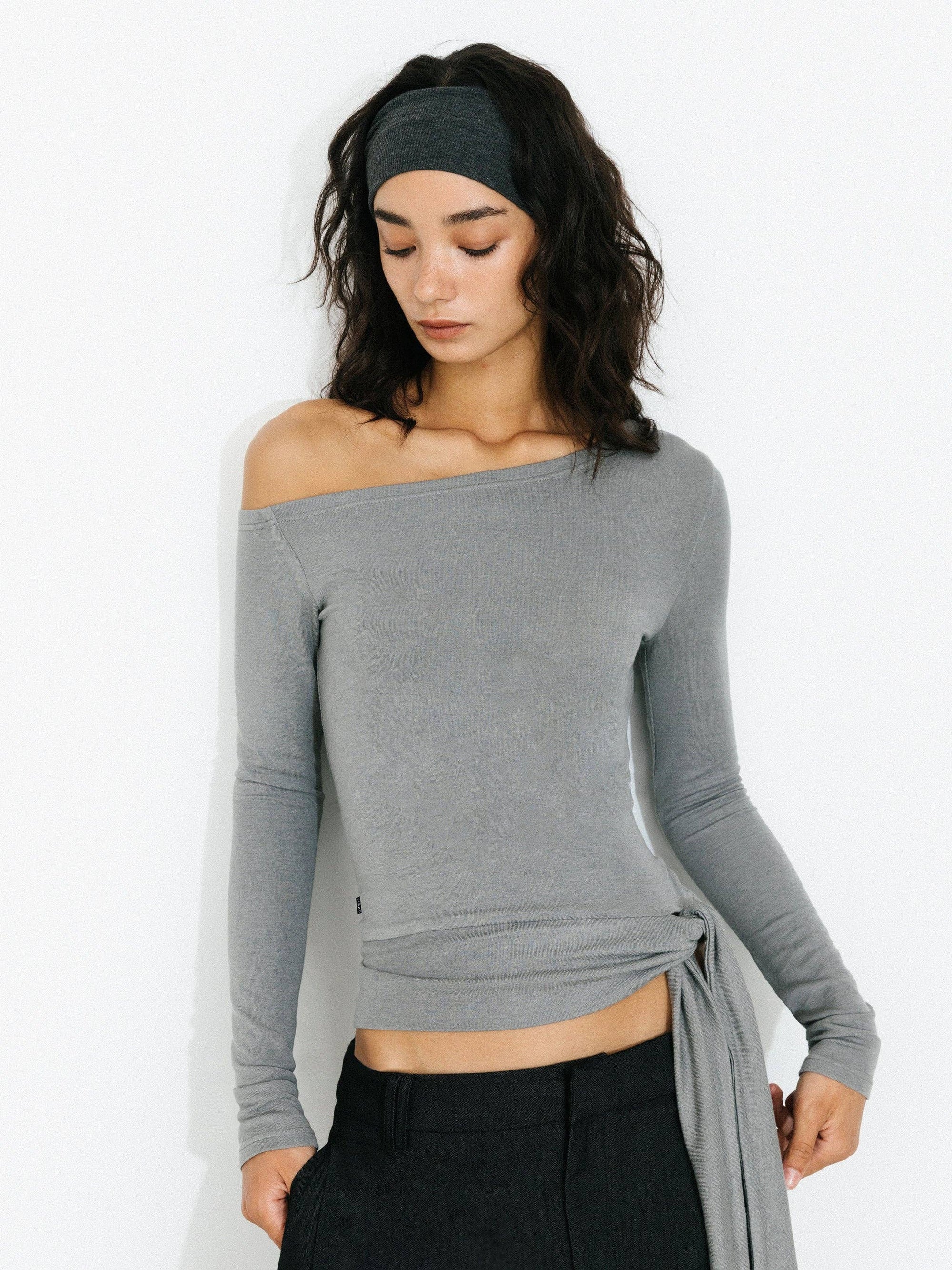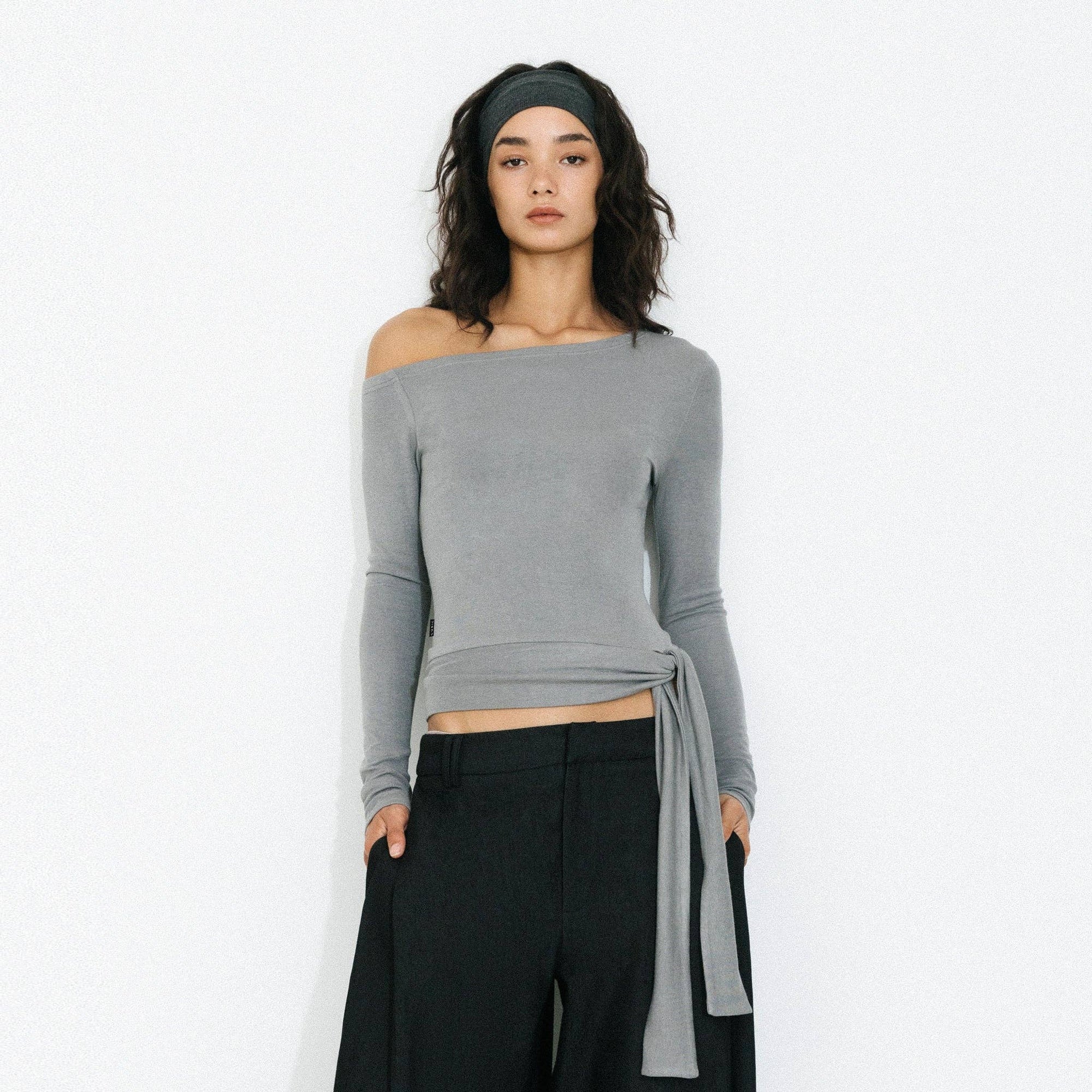 Cubic | One Shoulder Long Sleeve Tie Top in Gray